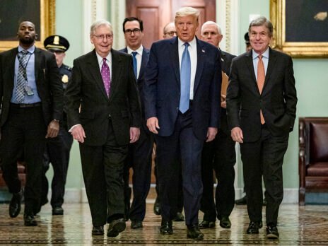 U.S. President-elect Donald Trump, U.S. Vice President-elect JD Vance, U.S. Senator Tom Cotton (R-AR), U.S. Senator John Barrasso (R-WY), U.S. Senator Shelley Moore Capito (R-WV) and Senate Majority Leader Sen. John Thune (R-SD) look on, after a meeting with Republicans in Congress at the U.S. Capitol building in Washington, U.S. January 8, 2025. REUTERS/Jeenah Moon